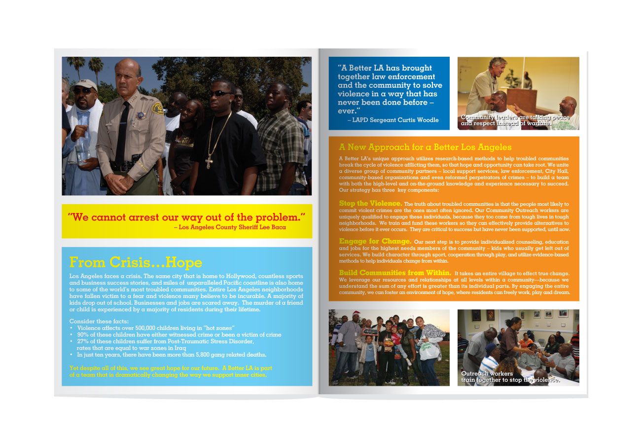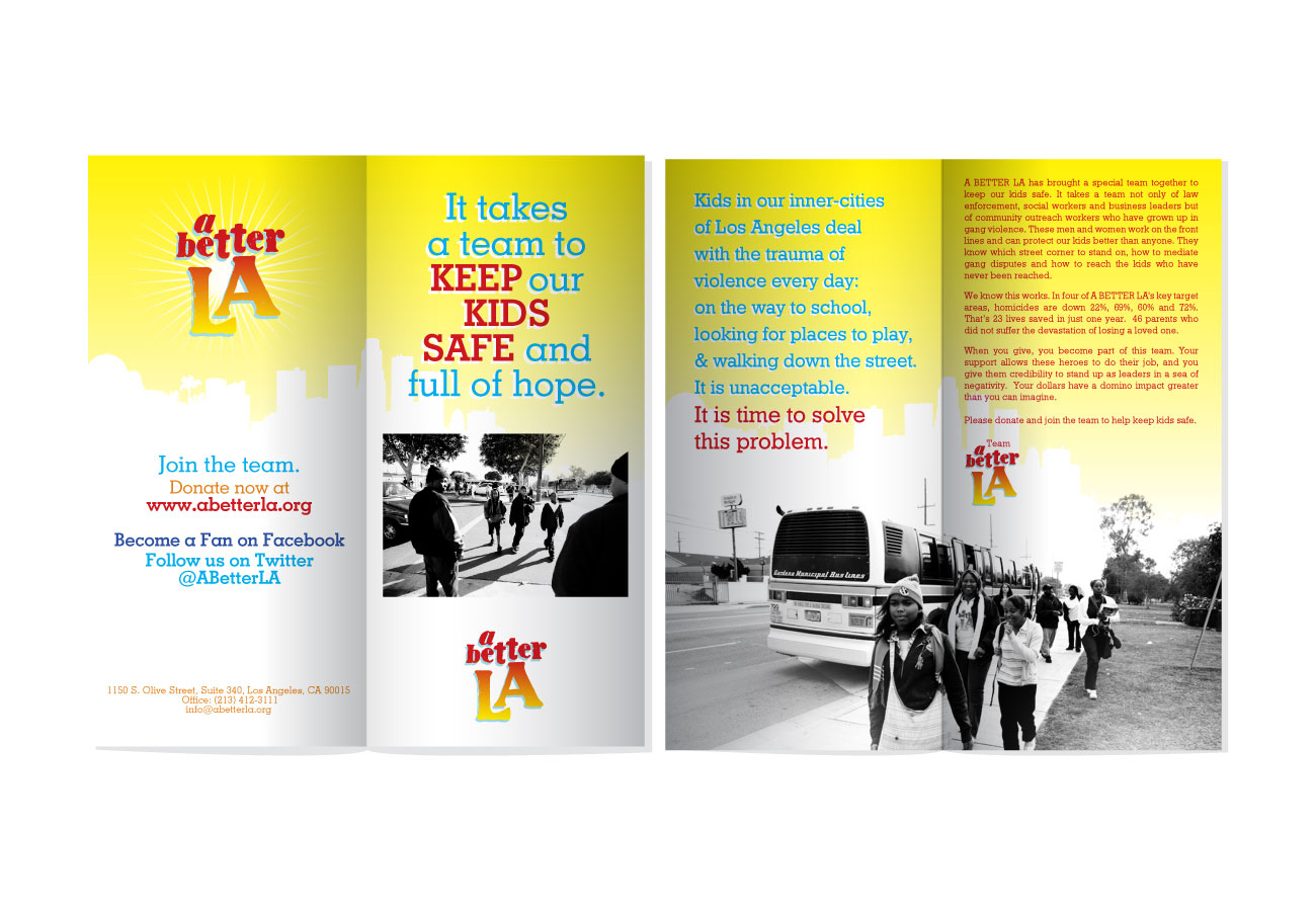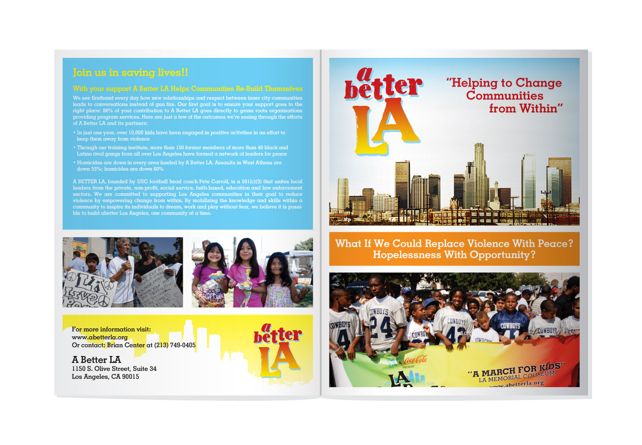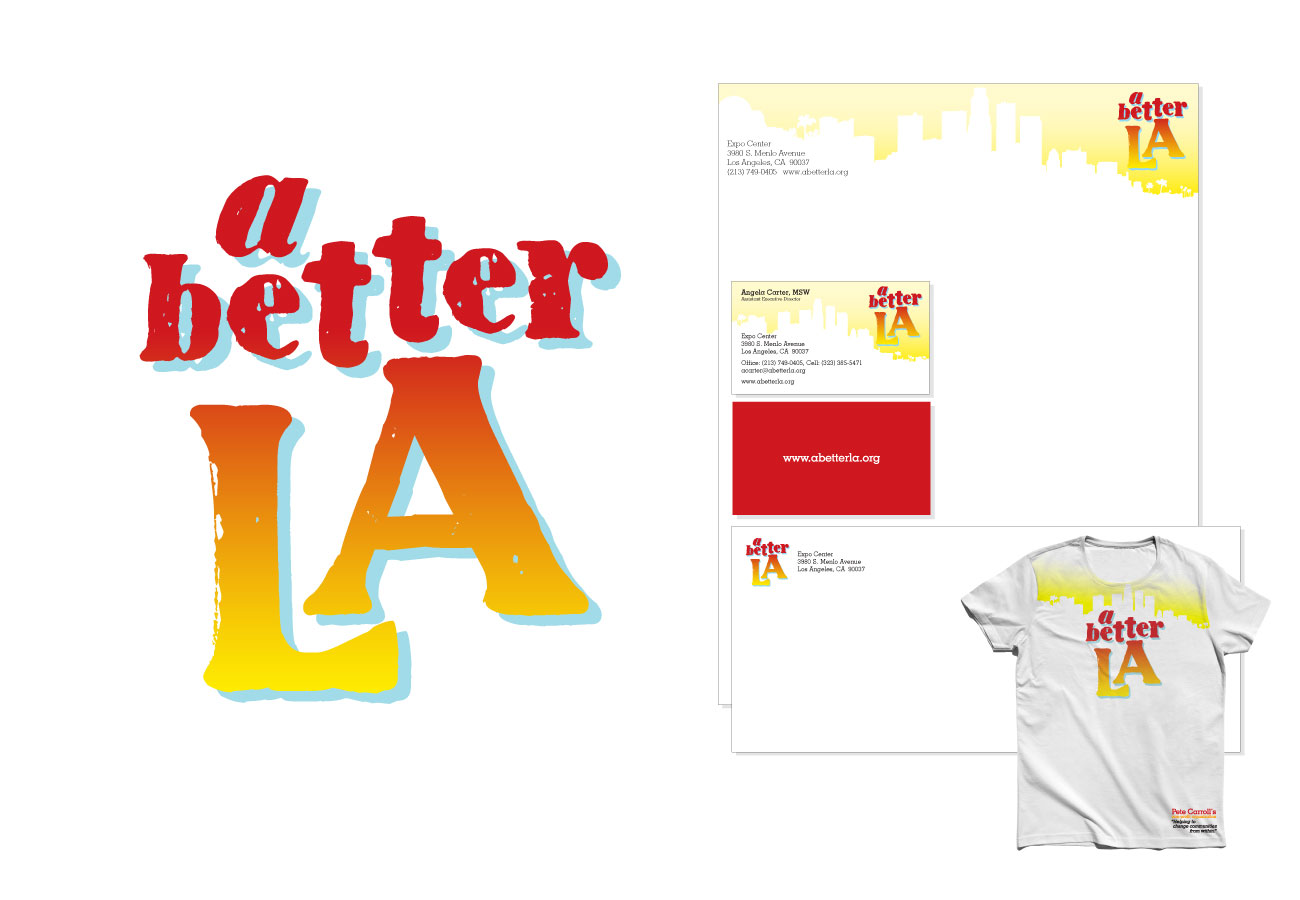 Commissioned to develop branding and collateral for NFL coach Pete Carroll’s nonprofit “A Better LA”. Final deliverables included full stationary branding kit, apparel design, brochures and flyers, and web mockups.